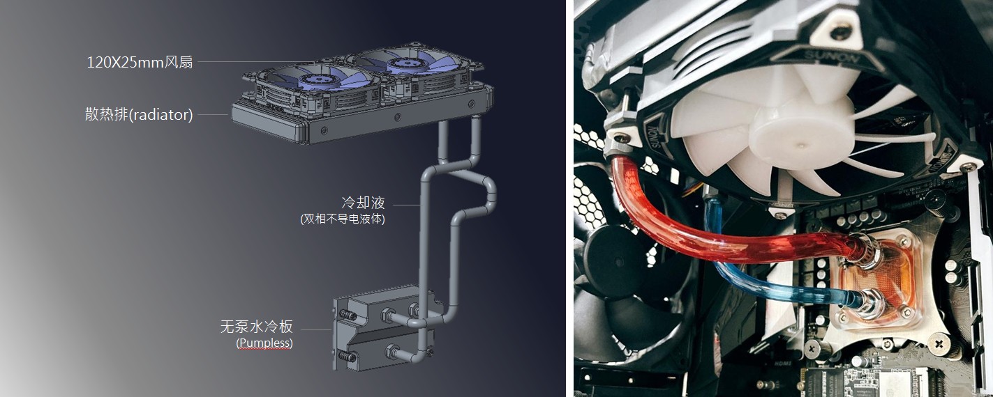 工作站強大的運算能力,仰賴高性能多核心的CPU、GPU處理能力,要維持全年無休的高效運作則仰賴高可靠度的散熱系統;建準自驅式相變液冷技術可以幫助工作站維持良好的工作溫度,且長效、高可靠度的散熱設計,能降低工作站液冷散熱系統漏水、當機甚至損壞系統的風險。建準自驅式相變液冷技術藉助流體相變化的壓力與密度差異產生對流,將CPU、GPU、DCU產生的熱垂直輸送到散熱排(radiator),再搭配高效散熱風扇將高溫液體降溫并將已汽化的蒸汽凝結成液態后送回原處,形成一個快速的散熱循環;透過雙相不導電液體的汽化與凝結過程就足以維持液體的流動形成循環散熱,無需泵浦,除提高系統的可靠度,更具有降低成本、降低噪音、降低震動、降低故障與更容易維護的優勢;另在冷卻介質的選用,建準更是重視良好的物質兼容性避免設備故障,不導電、不可燃,更不會破壞臭氧層,全球暖化潛值低(Low GWP)。以一個工作站中需要快速解熱的顯示芯片(GPU, TDP 450W)應用為例,僅需240mm散熱排(radiator)搭配2顆120X25mm風扇的自驅式相變液冷散熱器內含環保安全的冷卻液(GWP =2)即可以維持工作站長時間不降頻的高效穩定運轉。