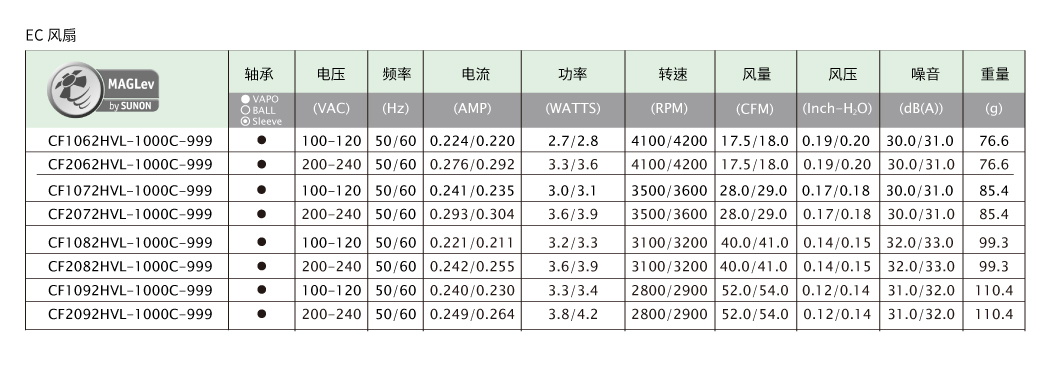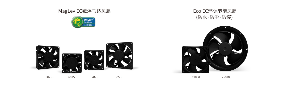SUNON 交流風扇系列具有風量穩定和長效散熱的特性,從60mm~250mm風扇產品廣泛應用于工業設備、商業設備、冷凍冷藏、醫療設備等。近年來在節能產品發展趨勢下,也發展一系列ECO-EC風扇,采用高效馬達搭配各種控制功能,以達到降低能源消耗的設計需求。并可依客戶系統使用于各種嚴苛環境,提供各種防護等級IP21~IP68防水防塵與ATEX 防爆防護。我們不僅提供專業的產品服務以保障產品長效使用、安全可靠性,同時提供高質量和高效率的最適化交流風扇解決方案以滿足各產業的散熱需求。 超省電 全程轉速管控 在交流風扇應用中,暖通空調、冷凍冷藏、工控等設備均需透過各種控制達到最佳效能與節能的目的,SUNON ECO-EC風扇依應用系統的需求提供不同的控制機制如內建電子回路傳送訊號至客戶系統控制端,隨時偵測散熱風扇的運轉情況;數字控制(PWM)調速設計,實時調整設備使用當下的最佳散熱狀態,有效減少不必要的能源消耗。 大風量 扇葉優化設計 SUNON EC風扇透過專業的扇葉優化設計軟件,仿真優化扇葉的曲度和面積,設計各種不同風量與風流的產品。新一代EC 風扇更更大的扇葉曲度設計,提供更集中的風流,也讓氣流吹得更遠,達到風扇整體的散熱效能升級。 長壽命 MagLev 馬達技術 SUNON MagLev EC風扇透過卓越磁浮馬達的垂直磁浮引力系統,馬達運轉達到定點定軌的穩定運轉軌道,重心穩定較不易搖晃震動,減少軸心與軸承接觸摩擦,再配合VAPO軸承技術,材料和結構皆經強化處理,改善普遍SLEEVE軸承不耐高溫的缺點,讓風扇達到低振動、低噪音、長壽命的多項優點。 MagLev EC風扇應用: 機械設備電控箱、工具機等、醫療實驗室冷藏設備、商用冷凍冷藏、家用冰箱 高等級IP55 & IP68防水防塵風扇 SUNON提供IP55等級的EC風扇以符合高度潮濕的商用冷凍冷藏系統應用環境的需求,確保散熱風扇在高度潮濕的應用環境下還能長時間穩定運作。另外,SUNON的IP68 EC風扇能應用在戶外嚴苛氣候的設備環境如儲能系統、戶外充電站系統,不受鹽霧侵蝕保障散熱風扇可長效運作,SUNON可依客戶系統環境提供最適化高IP防護的EC風扇散熱方案。 風扇應用: 儲能系統、戶外充電站系統、商用冷凍冷藏系統 防爆ATEX新技術 SUNON防爆AC和EC風扇已取得歐盟ATEX防氣爆認證,亦提供客制化ATEX粉塵爆防護設計服務,能在具潛在爆炸風險的應用環境范圍內,直接對電氣設備的使用提供適當有效的安全裝置保護力。 環境永續意識抬頭,傳統冷藏設備使用的HCFC系列冷媒中的氟氯碳化物會破壞臭氧層,已遭各國禁用或減量使用。新世代冷藏設備陸續轉型,無氟的環保冷媒逐漸取代傳統冷媒,由于環保冷媒多為碳氫鹵化物,在常溫常壓下性質穩定不易起火燃燒,但在不同的環境條件下仍具有爆炸的危險性,SUNON的防爆風扇可符合新世代的冷藏系統的使用安全需求。 同時,散熱風扇具備防爆安全性是國際市場的必要條件,SUNON防爆風扇具備無火花防護性*,可應用在具潛在爆炸風險的應用環境如儲能和能源轉換設備系統,當能源系統異常時,可避免造成相關能源系統的損壞或引爆疑慮。另外,SUNON散熱風扇應用在各式工業制造產業內的多數電氣儀器和設備如金屬切割廠等制程,都有可燃粉塵爆炸性的危險,SUNON提供客制化ATEX粉塵爆防護設計服務,保障客戶終端產品的運作質量及使用上安全無虞。 風扇應用: 儲能系統、能源轉換系統、商用冷藏設備工、業制造業 高安全可靠度 符合多項國際安全規范認證 SUNON EC產品銷售各大洲,深知散熱方案使用安全的重要性,為提供海外客戶具高質量防護且無危害性的散熱方案,SUNON EC風扇取得多項國際安規認證項目以符合各海外市場對于輸入產品安全的規范。 風扇品質優化 SUNON EC風扇扇葉采用最適化的材料強度以符合不同應用系統環境溫度的需求,同時強化整體扇葉結構,以確保產品高可靠度。另外,SUNON因應客戶系統不同電壓需求采用泛用型電壓設計(90V~254V),風扇內建自動調節芯片不再需要考慮不同輸入電壓問題,提供客戶系統端的應用便利性。 恒溫性&溫度保護設計 SUNON EC風扇符合商用冷藏設備的適用溫度(-25℃~+70℃),亦提供應用在超低溫的商用冷柜環境(-40℃)的EC風扇方案,穩定散熱以保障冷凍速度快。 SUNON提供多項EC風扇保護設計以確保高質量可靠性,在考慮不同應用環境的電源穩定性,風扇內建電子回路可偵測到系統溫度過高或異常,風扇將自動降低轉速運轉甚至主動停止,避免風扇因過熱而損壞,當故障排除后將恢復正常運作。同時,依客戶端較高溫的應用操作環境如,SUNON EC風扇馬達通過具備絕緣等級F級* (材料零件容許最高溫度為155度)的保護力,確保內部材料不受高溫影響而老化損壞。 SUNON EC風扇系列 應用產業